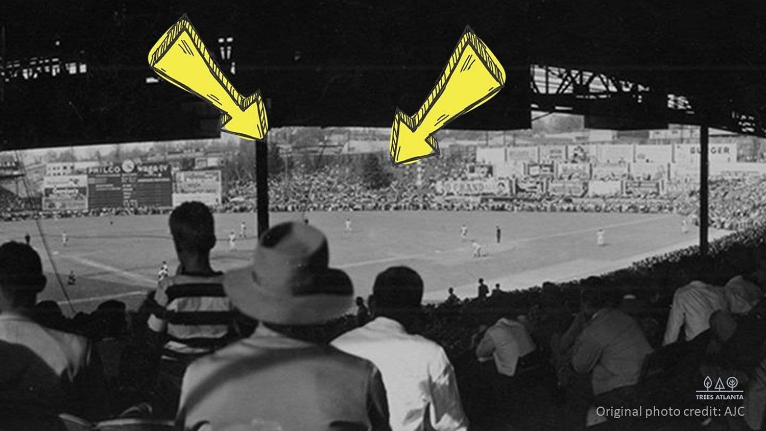 The trees stood in center field and remained “in play” 1947 when Earl Mann purchased the team and field and moved the outfield wall in about 50′. According to an article in Curbed Atlanta, “Two years later, Jackie Robinson of the Brooklyn Dodgers played in a three-game expo against the Crackers, which was the first integrated professional sporting event in Atlanta.”