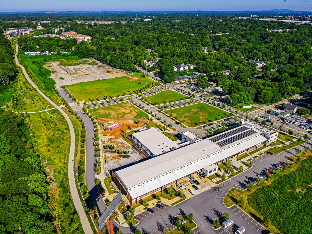 Atlanta Beltline, Inc. purchased 13.7 acres at 356 University Avenue. The purchased property is pictured at the top of this image and adjacent to the Atlanta Beltline Southside Trail, pictured to the left, and the grassy James Bridges Field and Pittsburgh Yards® in the foreground. Photo by LoKnows Drones.
