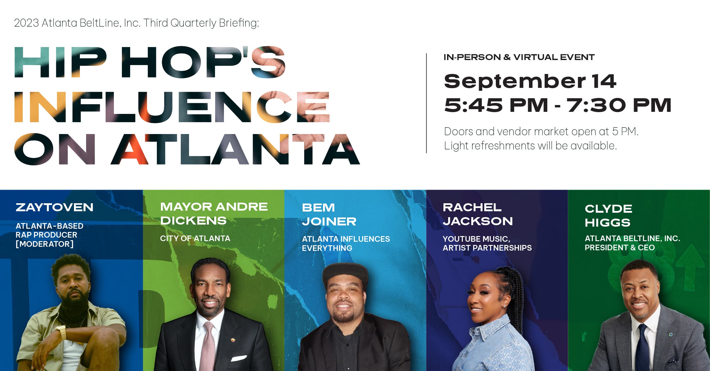 The Atlanta BeltLine’s third Quarterly Briefing of 2023 will feature a moderated conversation celebrating Atlanta as a major influencer, from hip hop to equitable infrastructure. Gathering an all-star, in-person panel, this hybrid meeting will explore Atlanta’s vibrant hip-hop culture and its deep connection to the city’s identity as part of the Hip Hop 50th Anniversary Celebration.