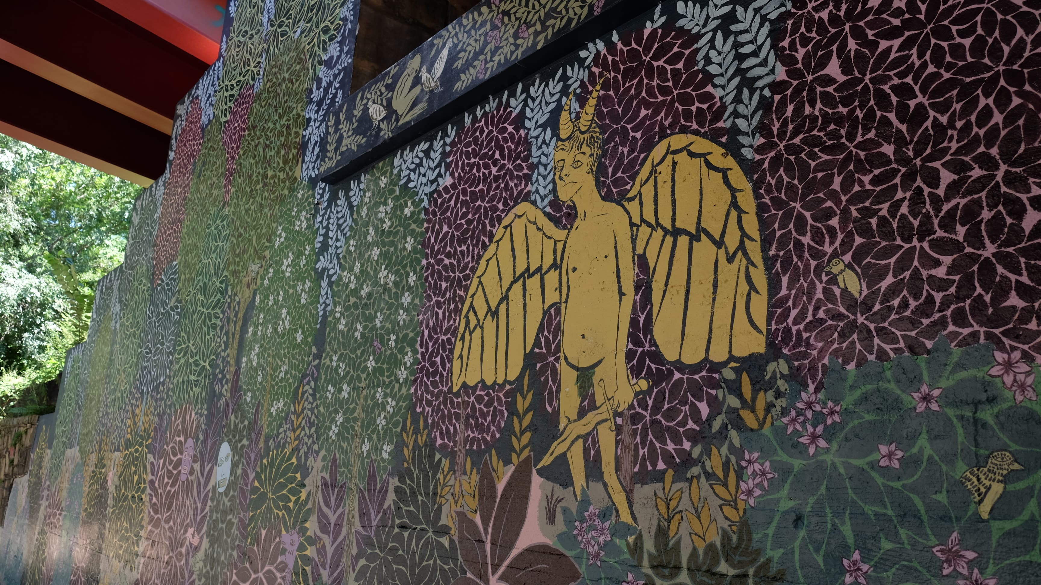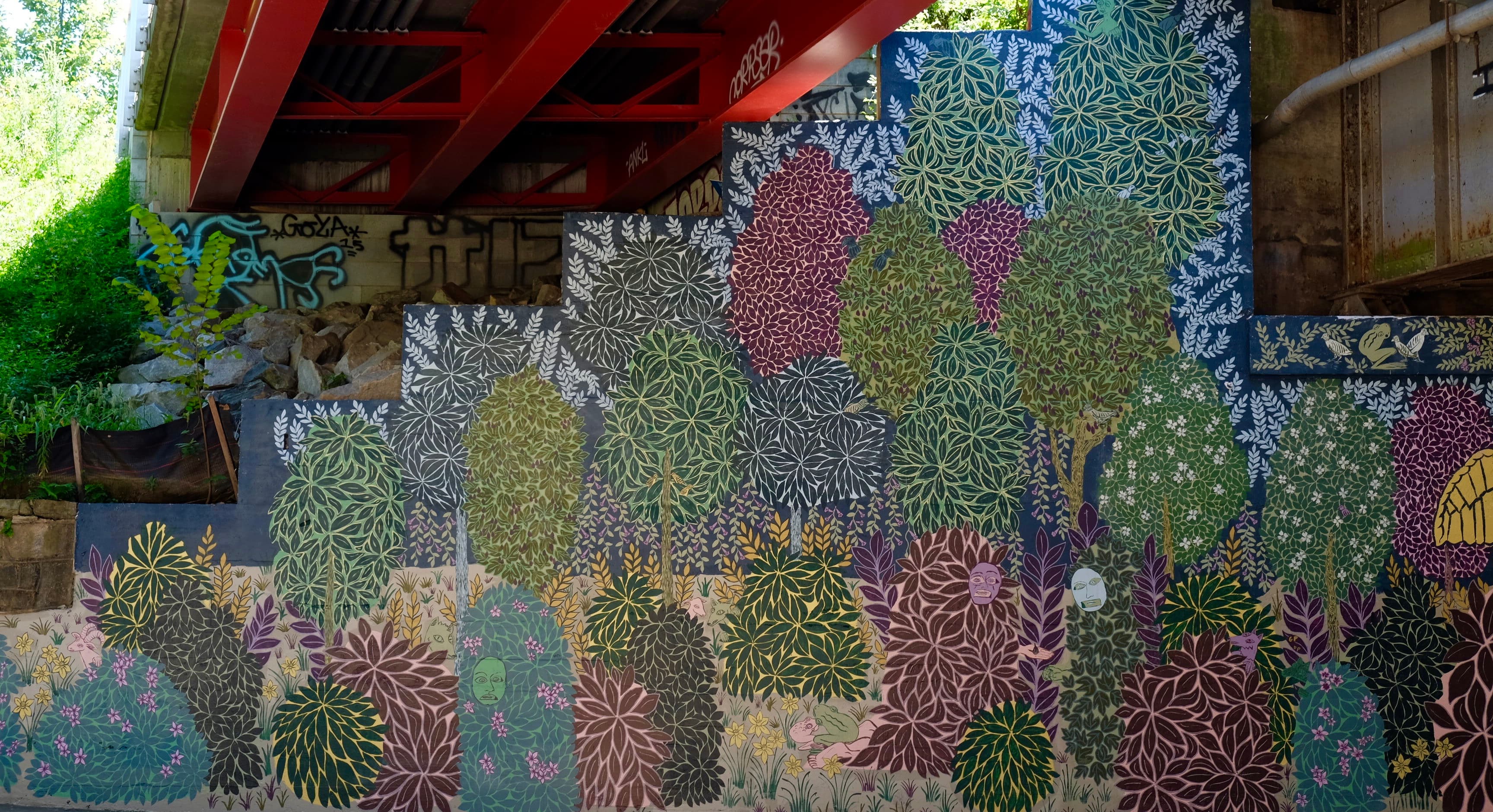 Atlanta has the nickname "City in a Forest" in reference to the dense urban foliage throughout the city. This mural reflects that name in its depiction of native Georgia plants seen on and around the Atlanta Beltline. Like all of Andrew Catanese's work, the mural will reflect the South in content as well as setting. The work acts as an exploration of place through flora and of the self through the figures hidden therein. The open narrative provides a structured viewing with room for interpretation and personal connection for the viewer, and focuses on the South and the many, complex relationships its people have.