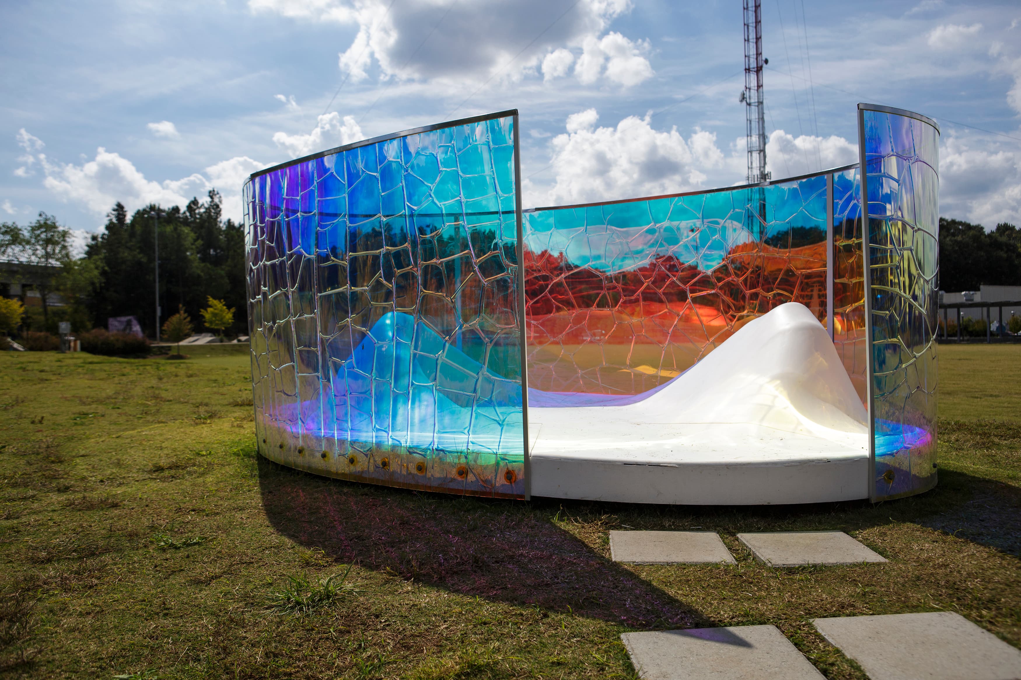 Nestled within the green corridors of the Atlanta Beltline, Dream Boat offered a resting place to drift, dream, and wander. Inspired by the phenomenon of iridescence, this seating arrangement shifted in color, reflections, and shadows throughout the day. There existed three main elements which contributed to the sensation of the space: iridescent walls, a curvilinear shape, and corian flooring.
