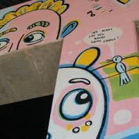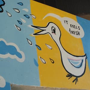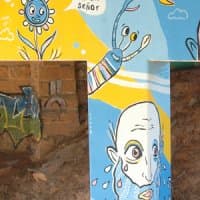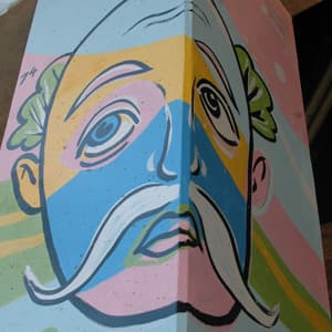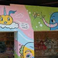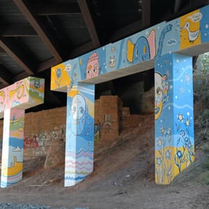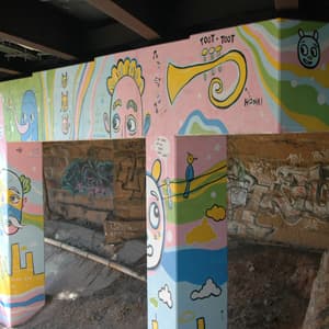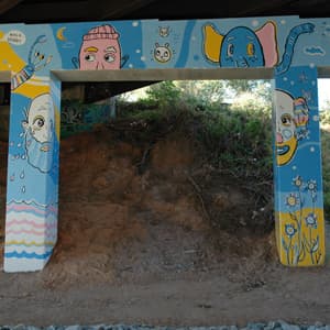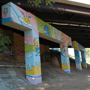 Wall mural. Large faces, eyes and friends, fun and bright. Looking out at you from under a bridge. Hi.
