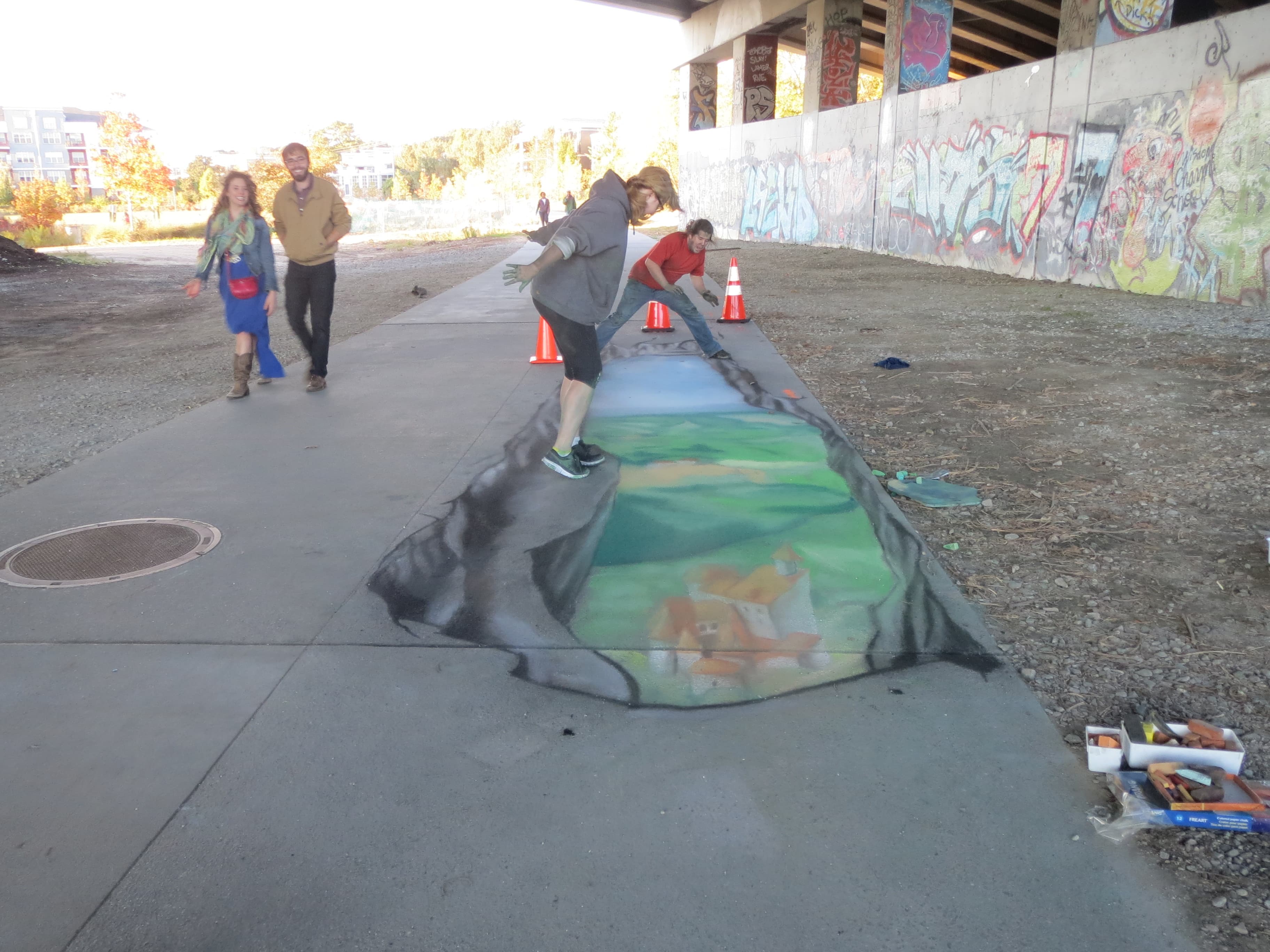 Imagining Ephemeral is a sidewalk chalk piece that displays the effects of weathering over time. Nature affects all things, natural and manmade. The sidewalk chalk medium itself depends on the stability of the world around it to last. The visual representation is temporary and the artist will come back on certain dates to redraw it. Each time, the work will be drawn a little differently and will evolve as nature itself does due to weather and time. If viewed from certain points along the Atlanta Beltline path the work looks three-dimensional.
