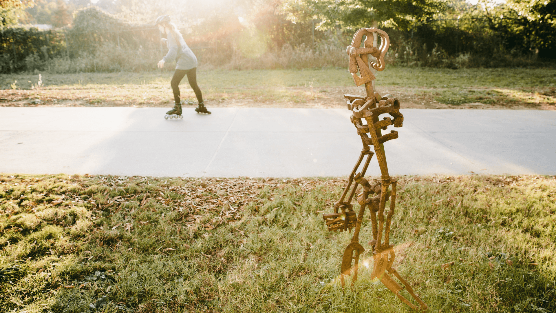 This artifact sculpture depicts three large human forms, each carrying tools and walking mid-stride in a single file line made from discarded railroad parts from the Beltline itself.