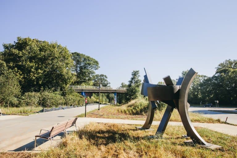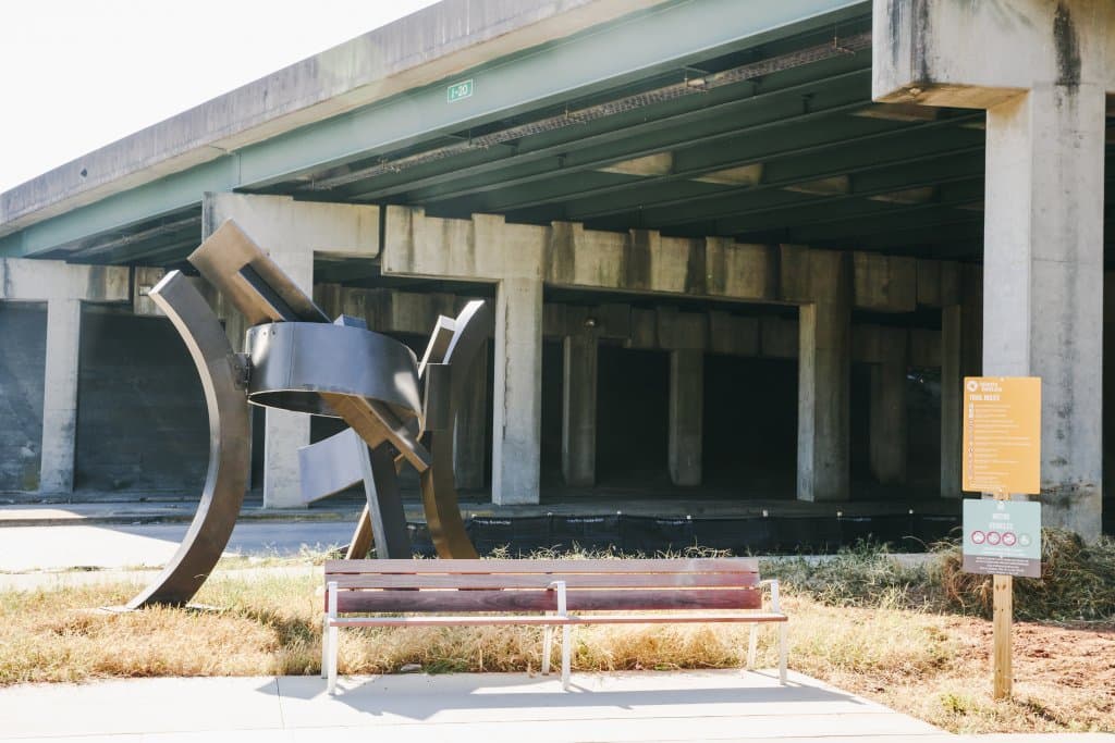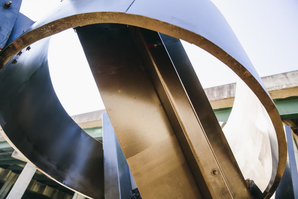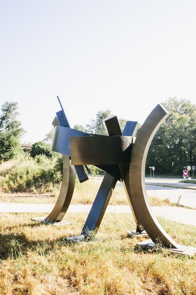 An abstract metal sculpture of welded and painted steel that address's a literary concept in the Greek vocabulary "Telos", meaning "completeness".