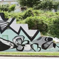 Exterior latex and aerosol on concrete. An abstract blend of lines, shapes and color, which create energetic and sophisticated compositions. These pieces are intended to give color and life to stark grey walls.