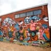 This mural champions the pedestrian over automotive transit. The colors speak to the multicultural and varied communities that make up Atlanta. Stylistically, the piece works in each artist’s vocabulary, with an emphasis on a flattened picture plane, resulting in a crammed, detailed composition even with simple forms: a surreal piece that depicts monumental figures traversing a landscape of vehicles as a metaphor for Atlanta.