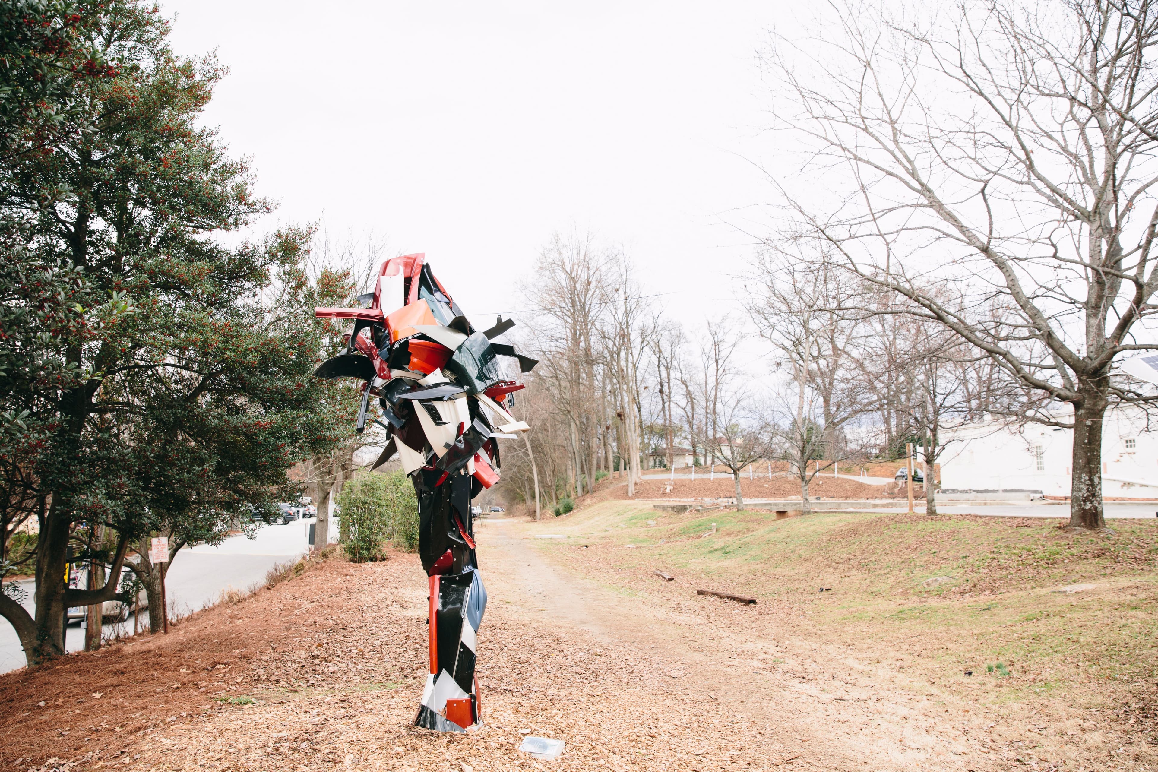This sculpture represents a gift given to nature and birds in particular. It is meant to be a safe resting place for birds to stop along their random journey. Of course, in addition, humans can enjoy and wonder about its funky abstract form.