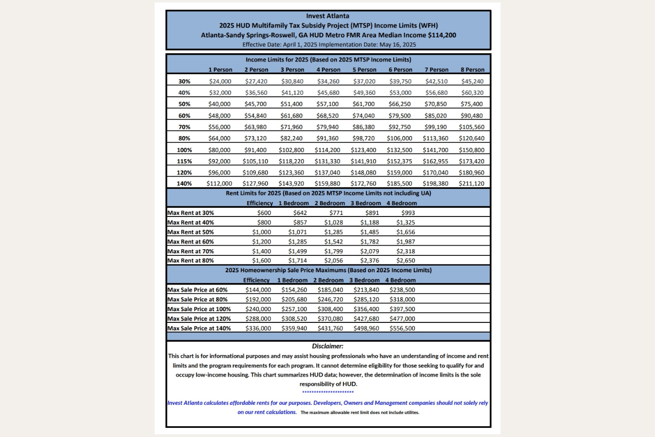 The U.S. Department of Housing and Urban Development (HUD) releases statistics each year on income for metropolitan areas. The city of Atlanta is in the Atlanta, Roswell, Sandy Springs Metropolitan Statistical Area, or MSA, which includes 29 counties. HUD calculates the annual income of families in this area and determines the income that is in the middle and calls that the AMI for the area, which is also dependent on family size.