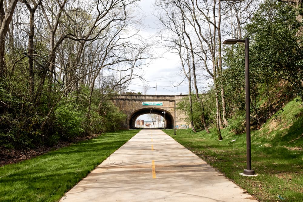 Passing north through an old railroad tunnel under Donald Lee Hollowell Parkway. March 2021.