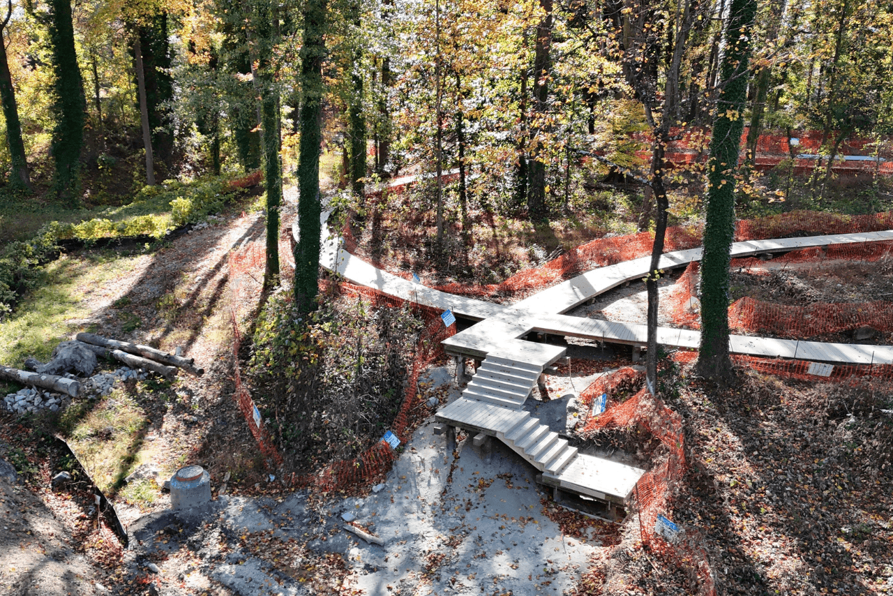 side of Atlanta. The park has been broken into three sections: upper, middle, and lower. In the upper parcel, the boardwalk is nearly complete, streambank restoration is finished, kudzu removal is underway, and the creek overlook is about 80% complete. In the middle parcel, stormwater and grading work are ongoing. In the lower parcel, stormwater piping has been installed, grading is underway, and retaining walls are being poured and clad with stone. The team is working to complete the park by summer of 2026.