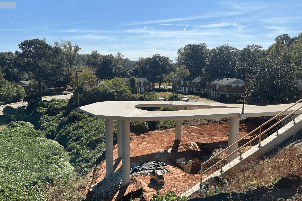 Pictured from left to right: Pond under construction east of the McDonough Tunnel. Access point walls under construction near Pryor Road. (Photo Credit: ABI Staff) Southside Trail – Segments 4+5: This trail segment runs 1.2 miles from Boulevard to Glenwood. The section between United Avenue and Ormewood Avenue is complete. The contractor will begin grading for the pond and constructing the last of the walls to tie into the United Avenue sidewalk, which will continue through early 2026. Handrail installation for the Ormewood Avenue pedestrian bridge will begin this month, with the ramp and stair work also scheduled for early November. Duct bank installation and grading for the upcoming trail pour between Ormewood Avenue and Glenwood Avenue are expected to be complete by mid-November. Trail pour is expected to be complete in early December. Underground utility challenges at United Ave have pushed out the expected completion date of the United Avenue ramp. Work is now expected to continue through the end of the year with the trail opening in January. The United Avenue bridge has an anticipated opening date of Q1 2026.