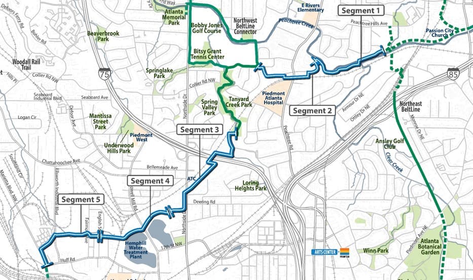 This 0.9-mile-long trail begins at English and Culpepper, generally going east until crossing Howell Mill Road and ending at the Monday Night Brewery parking lot at Trabert Ave.