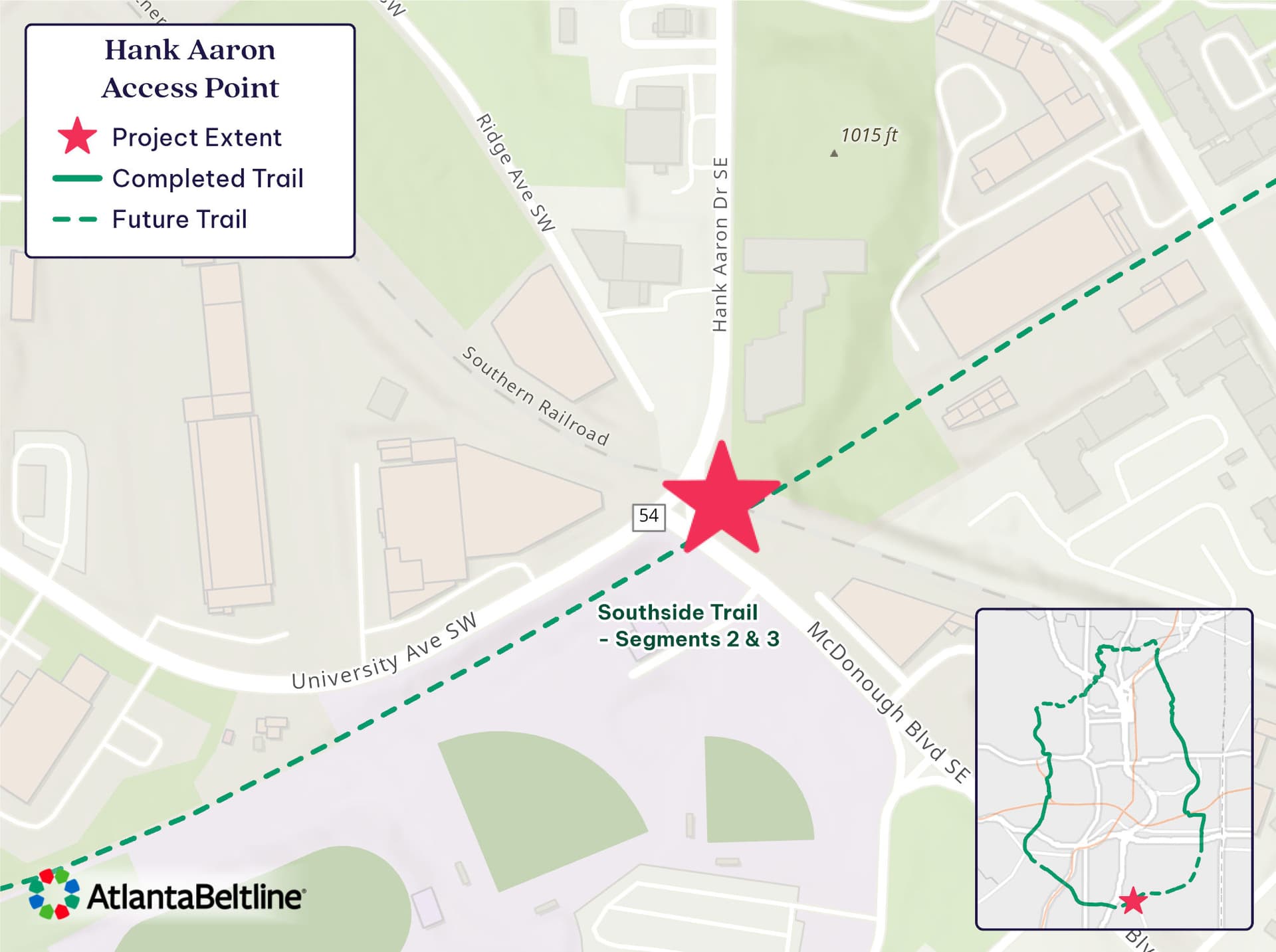 This access point will connect Segment 2 of the Southside Trail to the Hank Aaron Drive sidewalk, aligning with the signalized crosswalk serving the MARTA Summerhill BRT. This project began as a collaboration between the Beltline, the developer, and MARTA. Design was completed in November, and construction will occur after FIFA World Cup 26™.