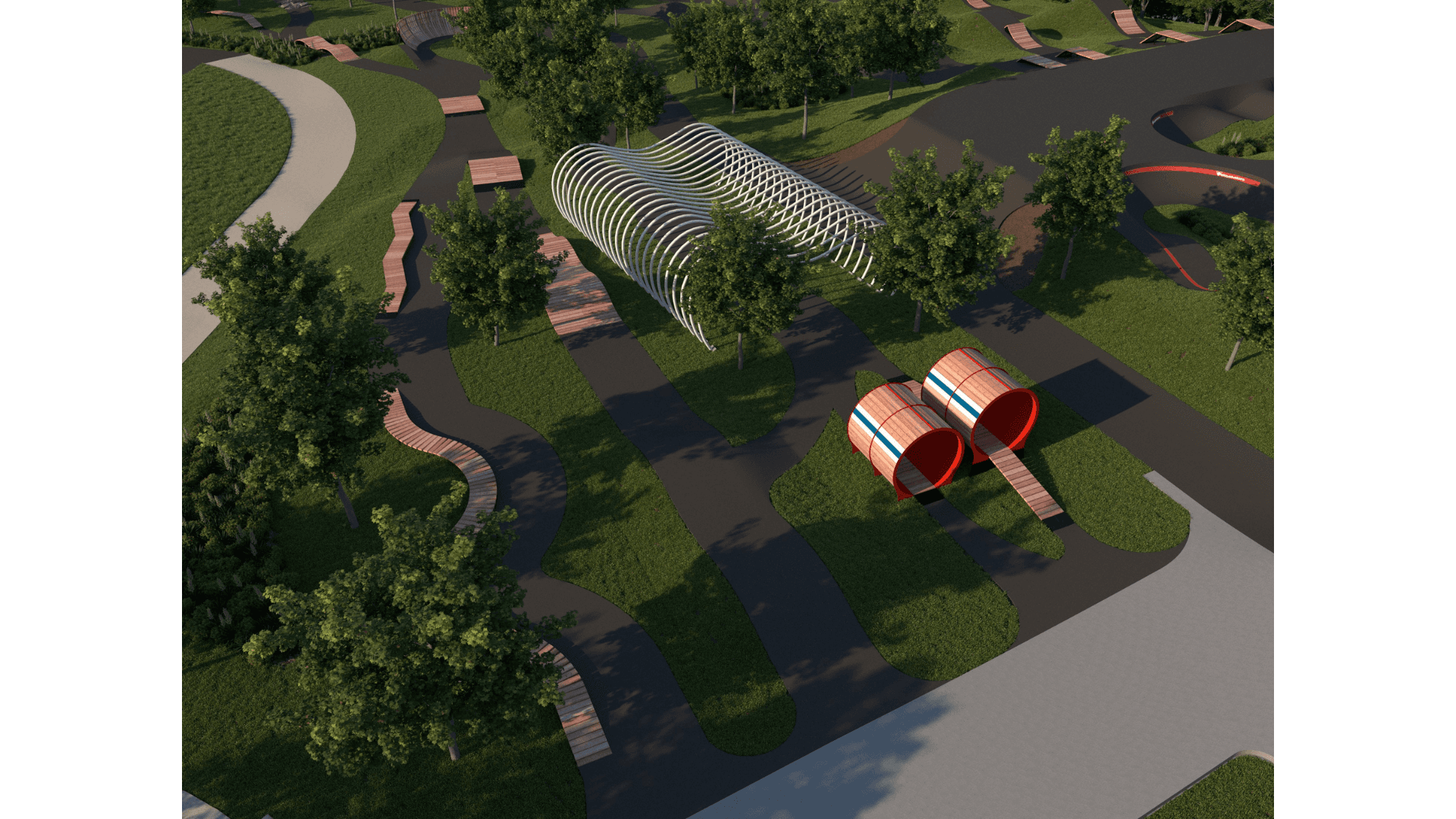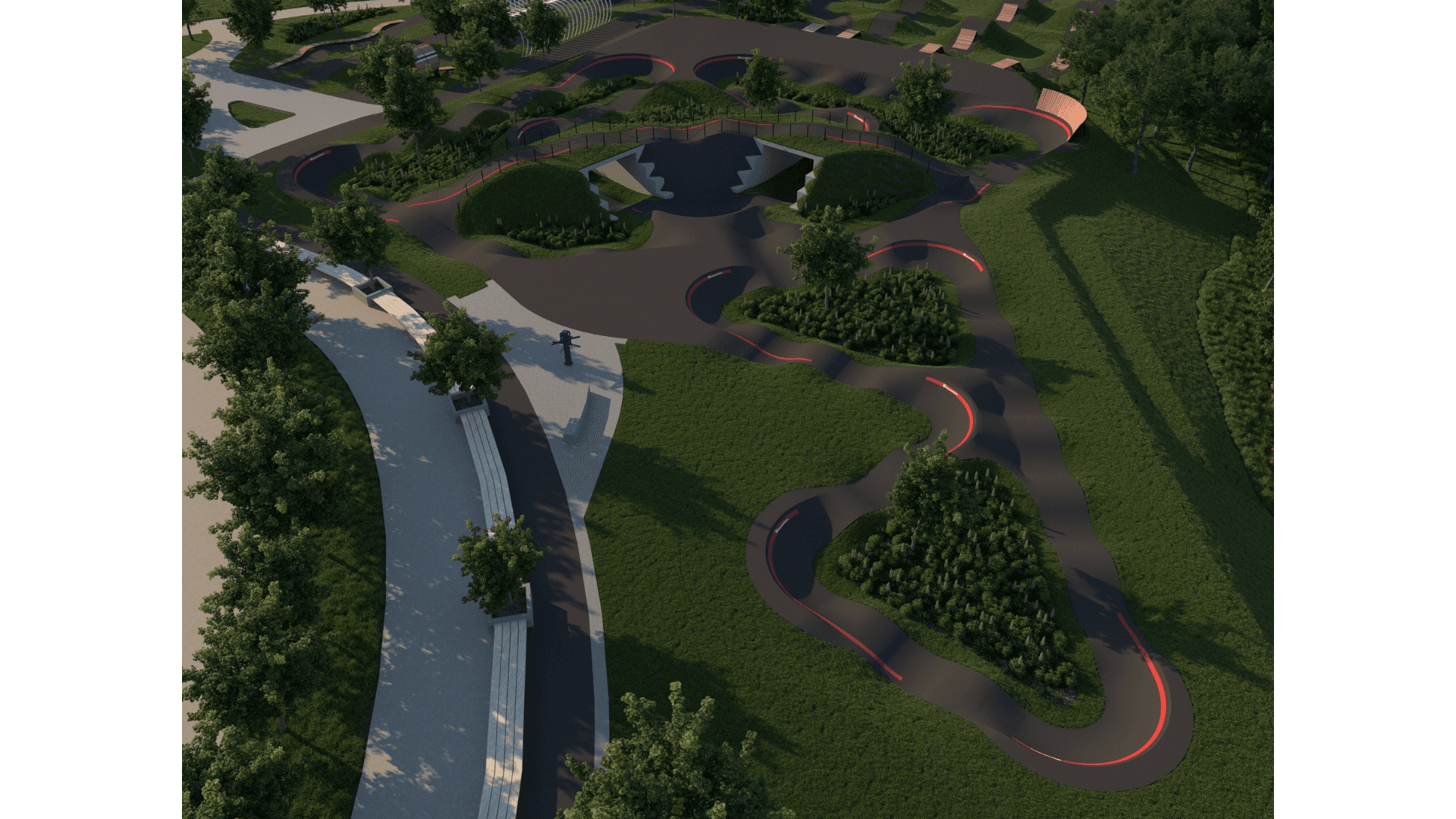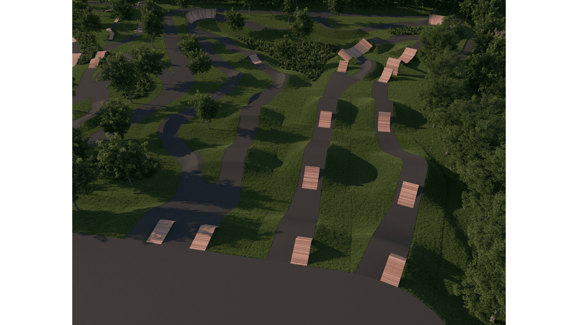 April 2024: Survey in park for bike trails and hiking trails was flagged and took place. The team will begin more detailed layouts for pump track and skills areas.