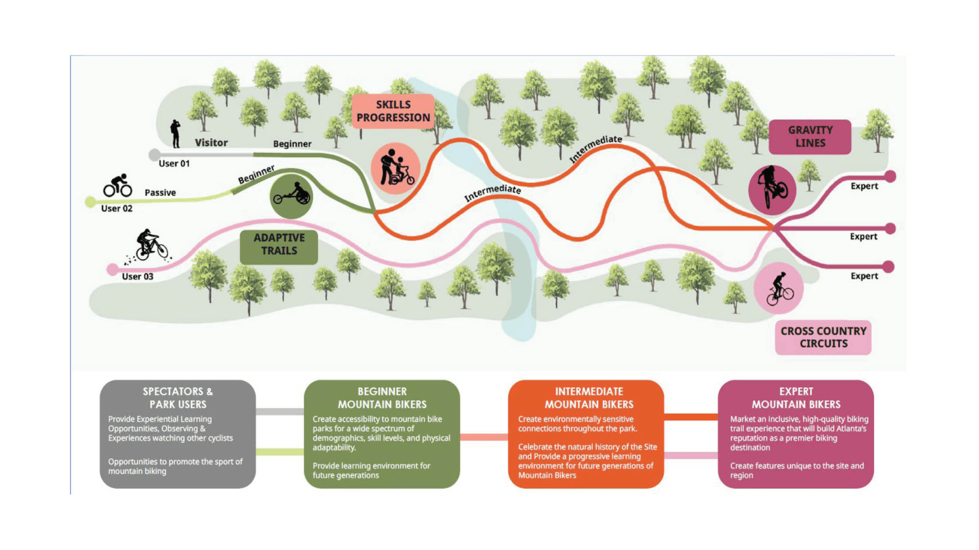 Once the project is fully funded and out of design, the Bike Park at Shirley Clarke Franklin Park will be one of the most unique and inclusive biking facilities in Atlanta, featuring 2.25 miles of mountain bike trails catering to various skill levels, a pump track, a bicycle playground, jump lines, a skills course, and hiking trails.