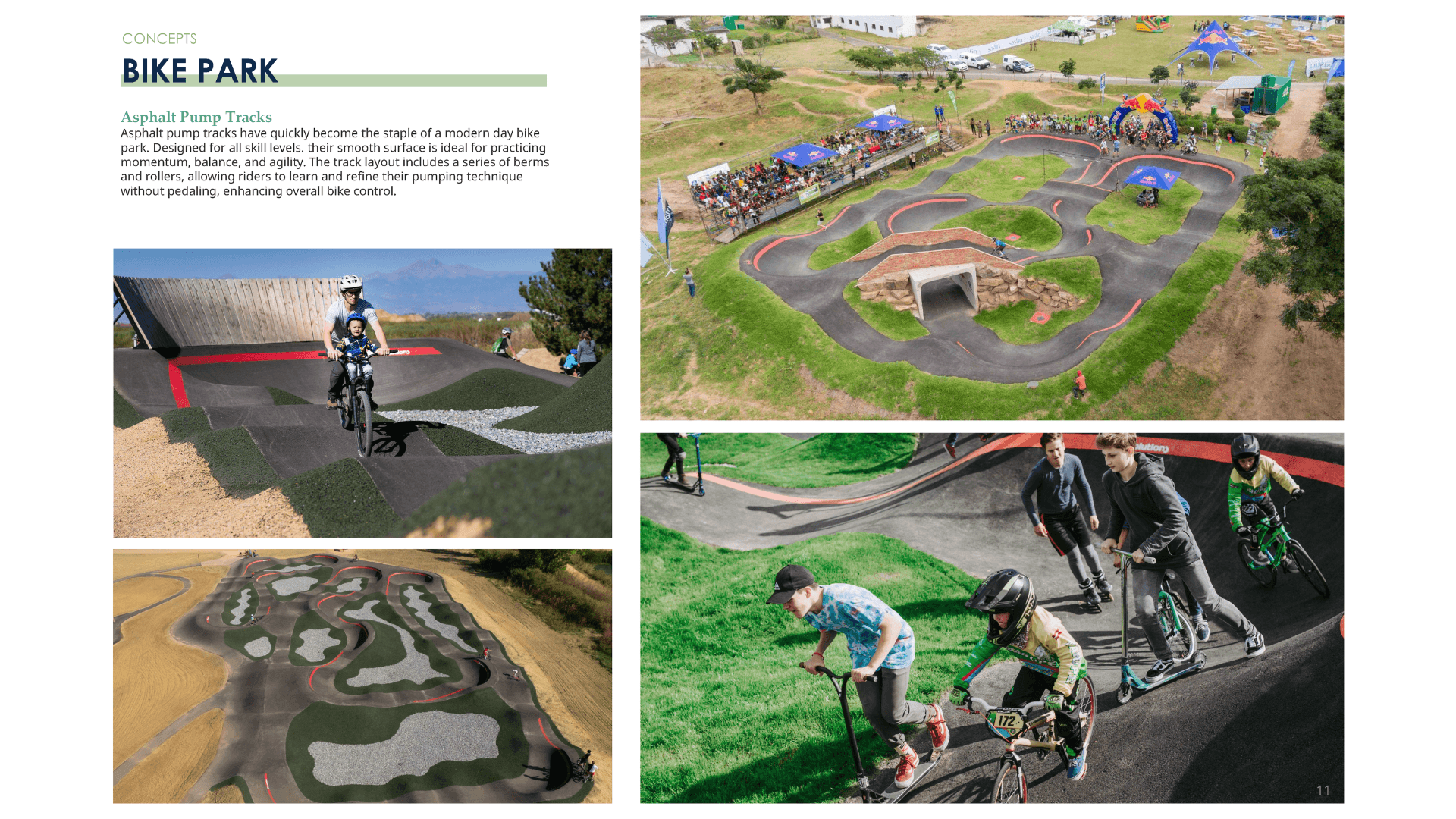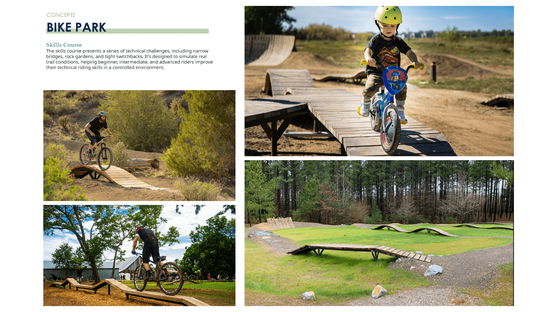 April 2024: Survey in park for bike trails and hiking trails was flagged and took place. The team will begin more detailed layouts for pump track and skills areas.